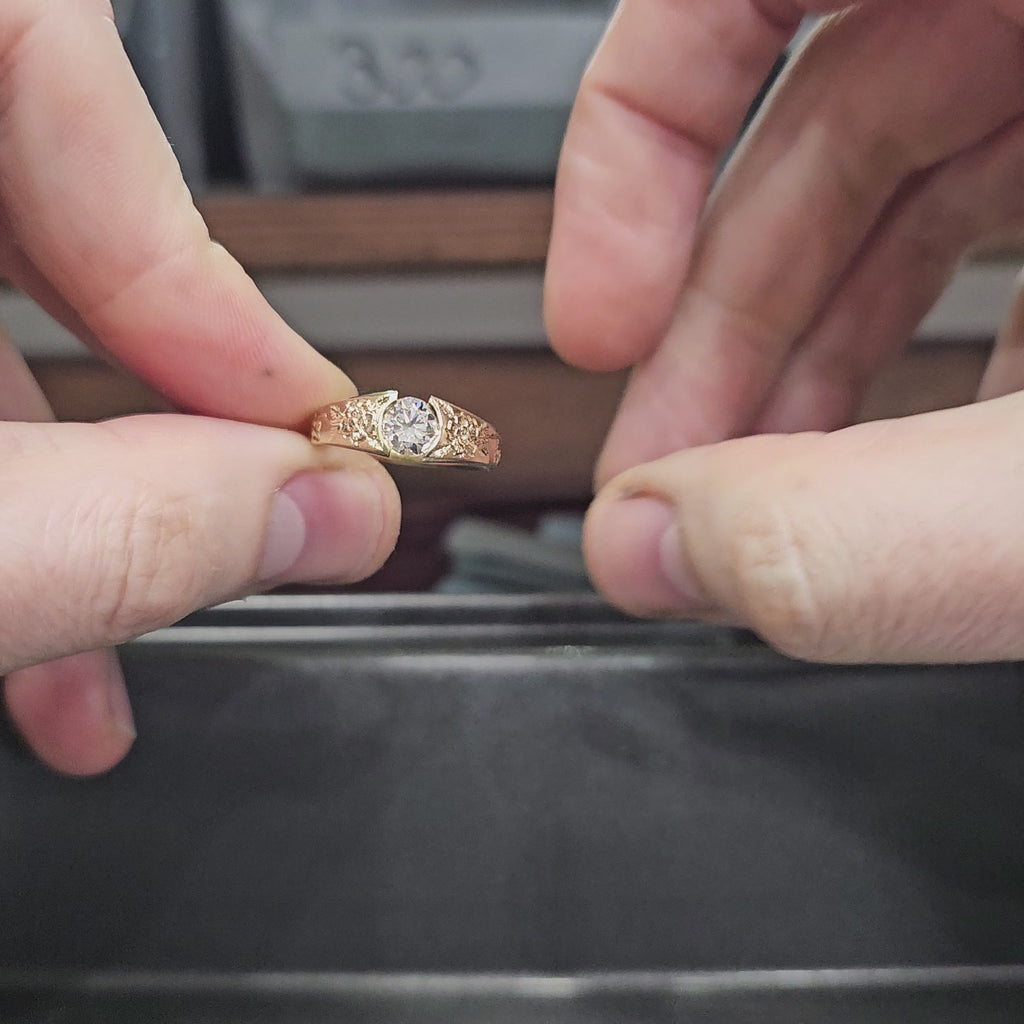 Crafted in 18ct yellow gold and set with a 0.70ct natural diamond, this ring began as one of my designs, Astra, and was transformed into something deeply personal. Hand-engraved roses wrap gently through the piece, chosen to reflect his partner’s love of them — a quiet but powerful symbol of devotion.